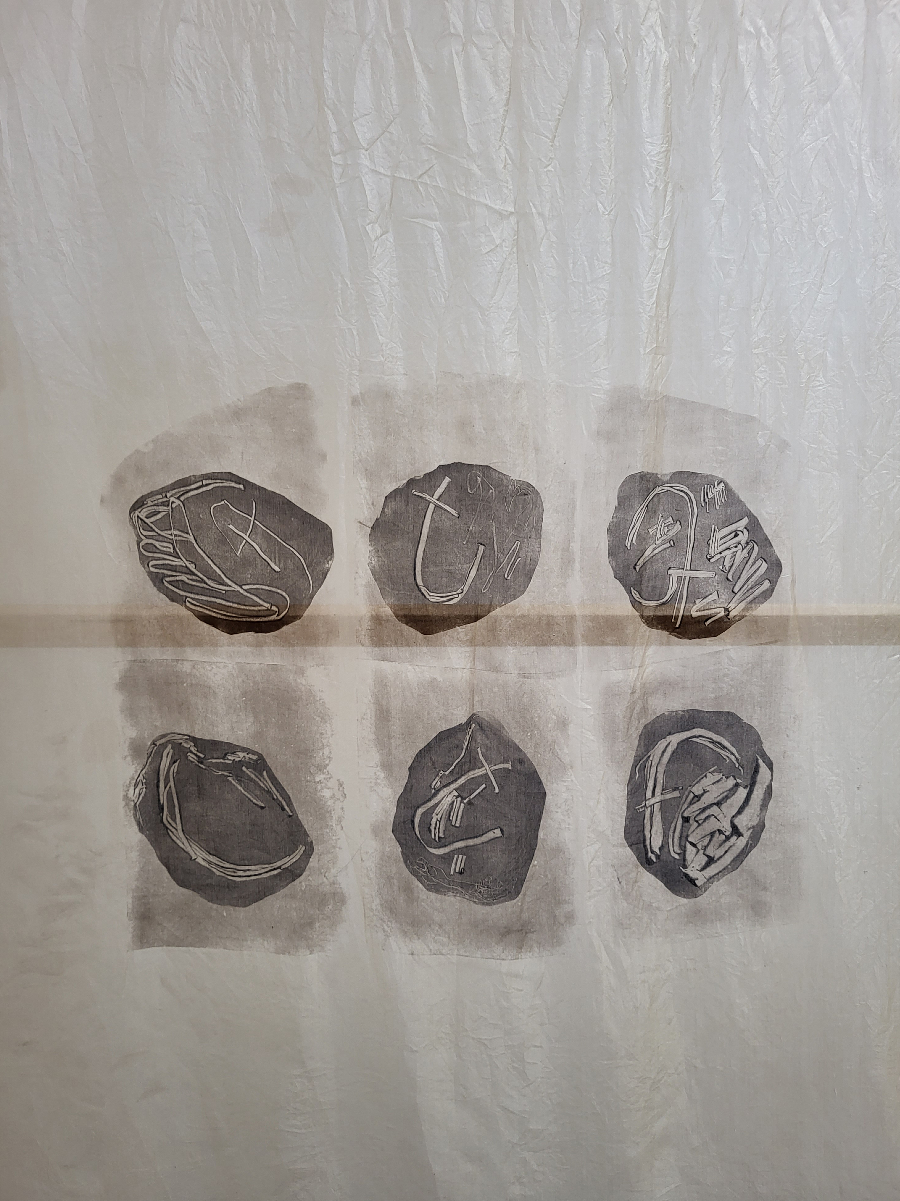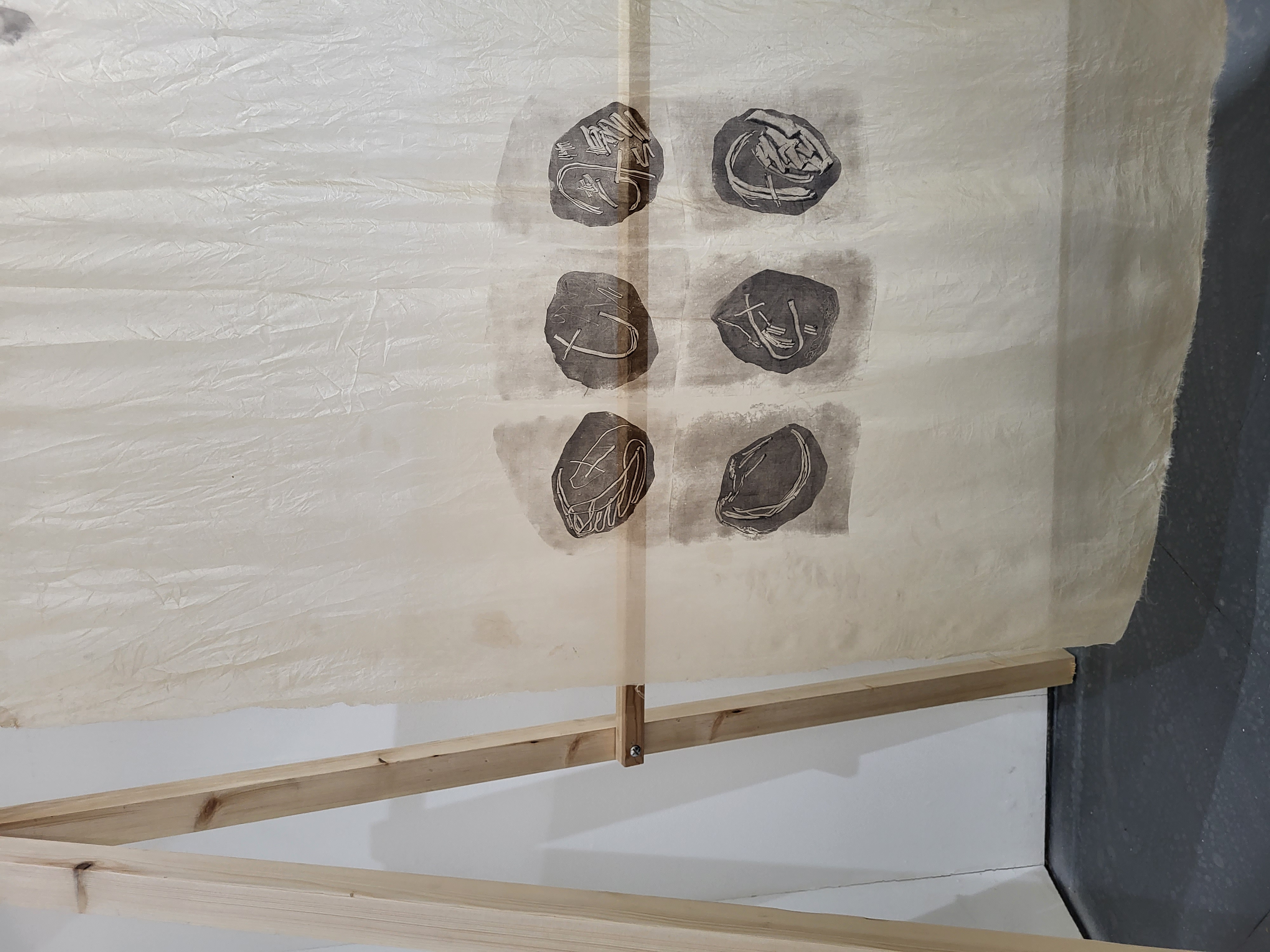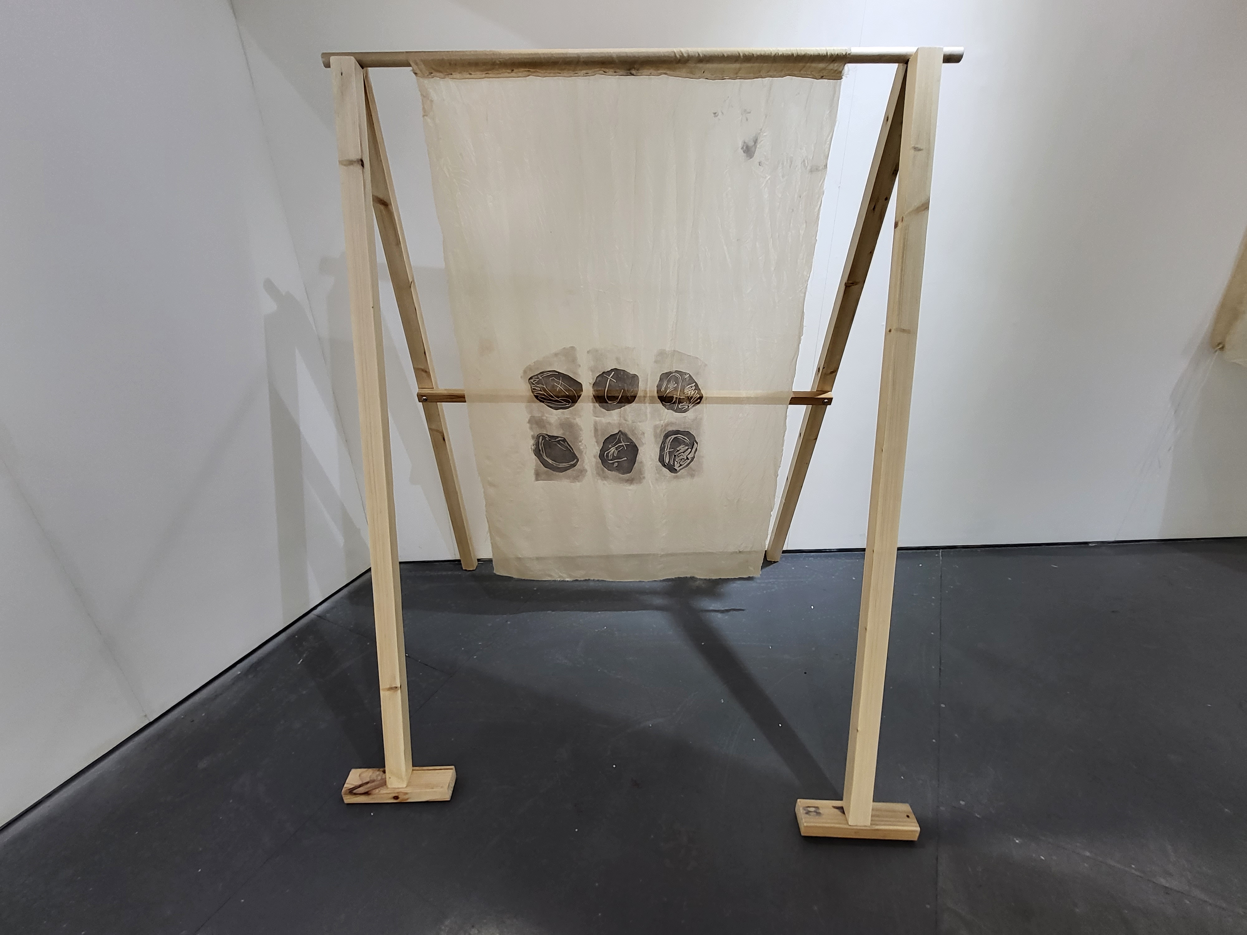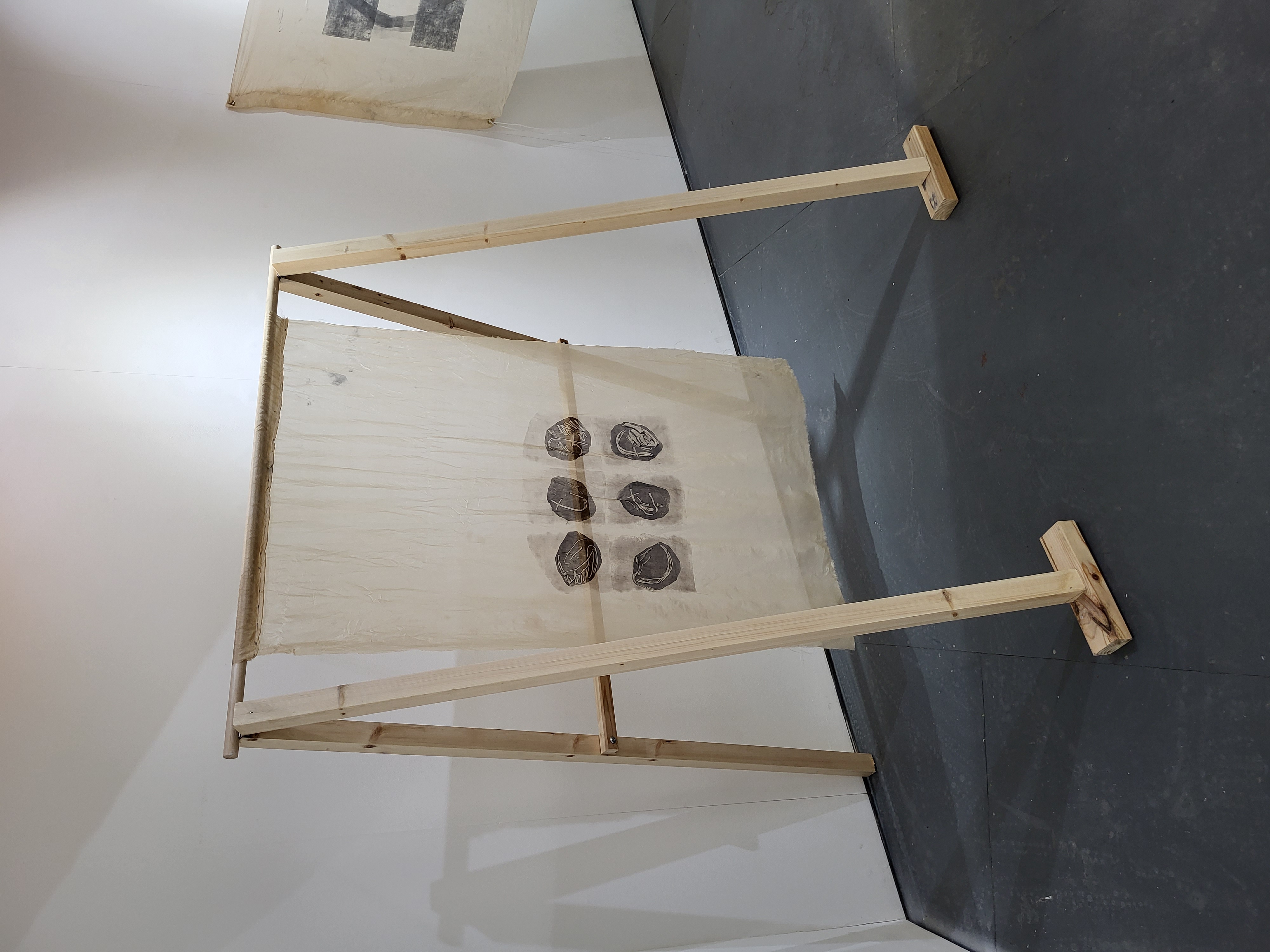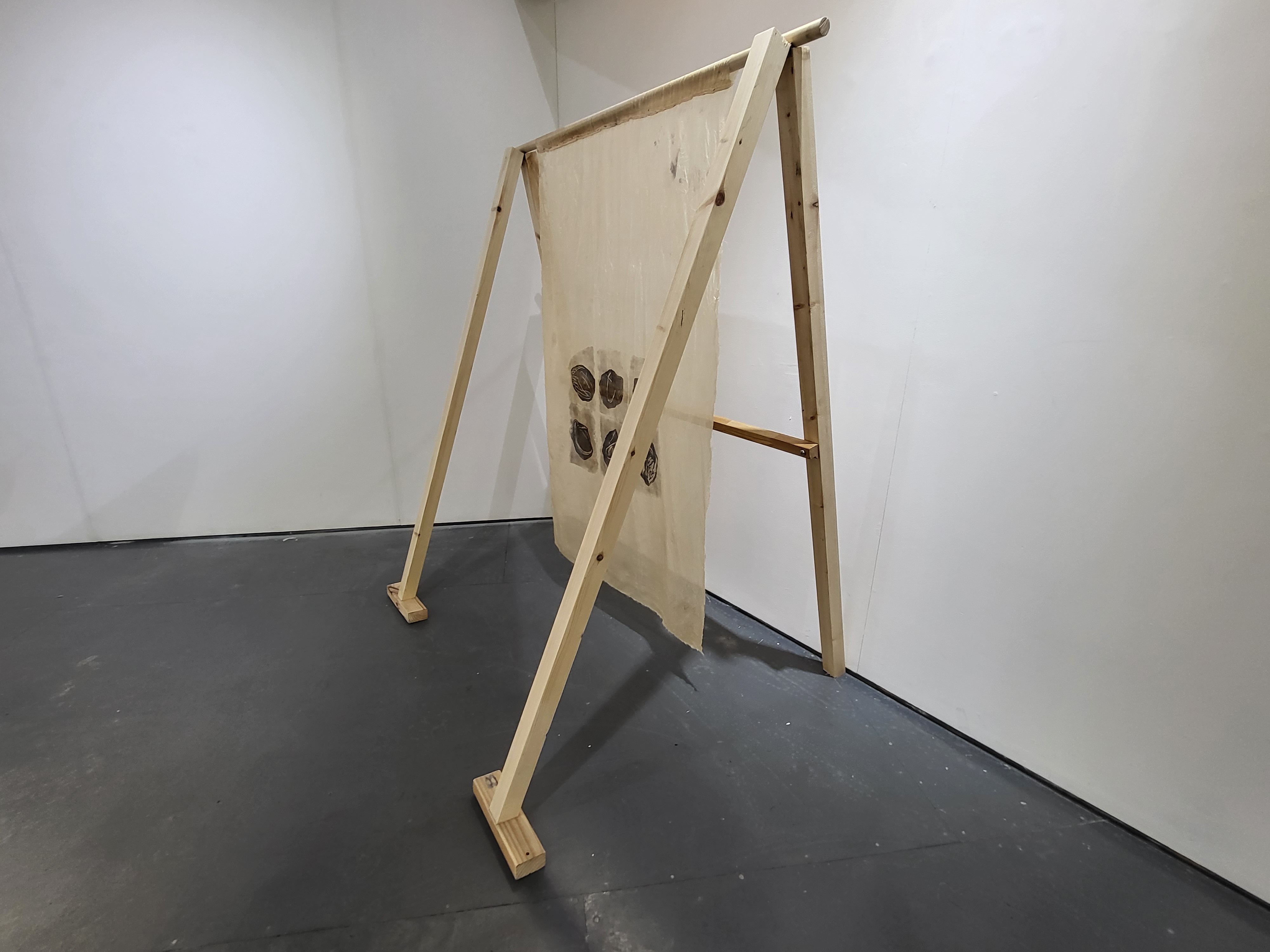Wood, scarfmaker’s silk, lino printing